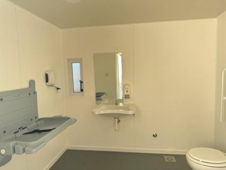 Se trata de un módulo sanitario, confeccionado en un contenedor marítimo metálico reciclado, que posee tres espacios: un baño para hombres, con bacha de lavado con espejo, mingitorio y box con inodoro; un baño para mujeres y personas con discapacidad, de amplias dimensiones, con inodoro y lavatorio, espejo y cambiador plegable para bebés; y un tercer espacio para personal de mantenimiento. Además, este nuevo servicio cuenta con secador de manos eléctrico, iluminación led y ventilación a través de ventanas de aluminio, contando con sus respectivas conexiones a redes de agua, cloaca y electricidad.