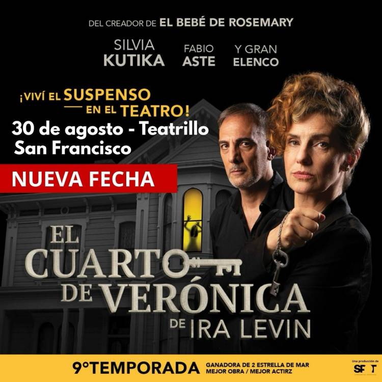 Del creador de "El bebé de Rosemary", Ira Levin, “El Cuarto De Verónica" es la obra teatral de terror y suspenso psicológico éxito en más de 30 países. Susan, de 20 años, mientras cena con su novio en un restaurante, es abordada por una encantadora pareja de ancianos que se muestra impresionada por su parecido con Verónica, fallecida hace mucho tiempo. Susan y su novio acompañan a la pareja hasta la mansión para ver el retrato de Verónica y comprobar el parecido. Allí comienza esta intrigante pesadilla con un final inesperado. Ganadora de 2 premios Estrella de Mar a "Mejor obra" y "Mejor Actriz”, estelarizada por Silvia Kutika, Fabio Aste y gran elenco, y con dirección de Virginia Magnano, "El Cuarto De Verónica" llega al Teatrillo en el marco de su gira nacional.