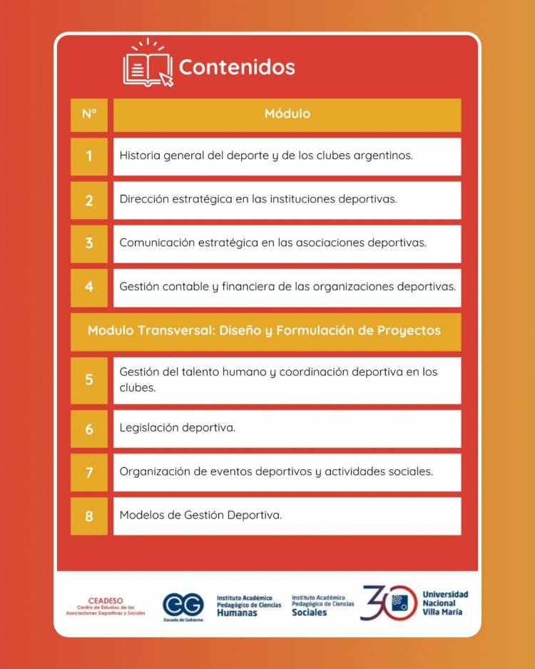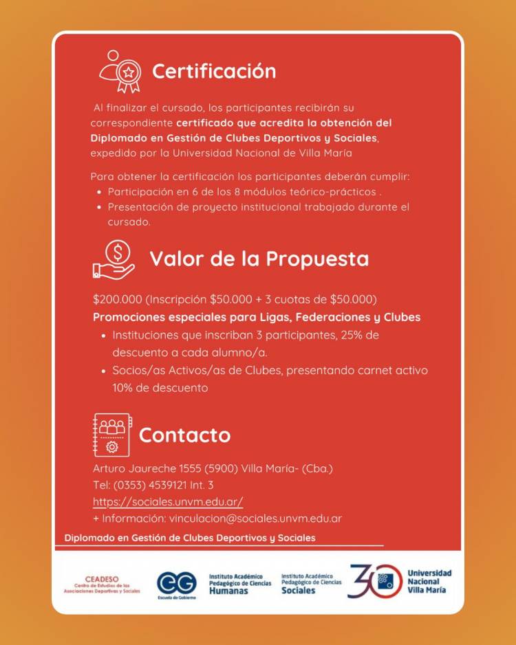 Se comenzará a dictar desde el día 23 abril del 2025 y tiene como finalidad profesionalizar y mejorar la gestión de clubes deportivos y sociales, fortaleciendo la estructura de estas instituciones clave en el desarrollo social y deportivo del país. En cuanto a los requisitos, se debe tener 18 años o más y contar con estudios secundarios completos o superiores.