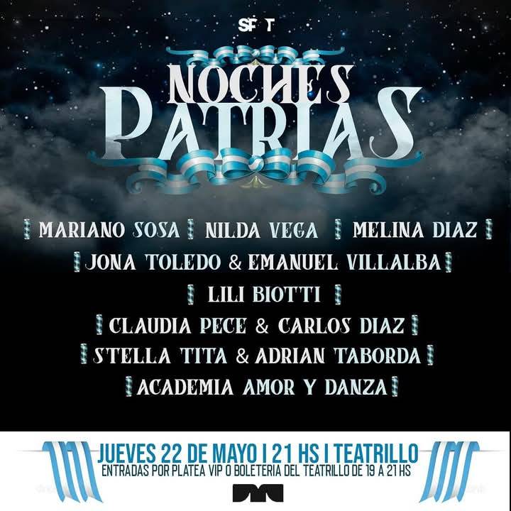 En el marco de las celebraciones patrias, se llevará a cabo el ciclo “Noches Patrias”, una propuesta cultural que reúne a destacados artistas de la ciudad en un espectáculo dedicado al folclore argentino. Este ciclo es un homenaje a nuestra identidad y tradiciones a través de la música, el canto y la danza, con actuaciones en vivo de talentos locales. Con producción de Spot Experiencias Artísticas, donde se busca resaltar, valorar y difundir a los artistas de la ciudad de San Francisco. En esta oportunidad los protagonistas serán: Mariano Sosa, Nilda Vega, Melina Diaz, Jona Toledo & Emanuel Villalba, Lili Biotti, Claudia Pece & Carlos Diaz, Stella Tita & Adrian Taborda y Academia Amor y Danza.
