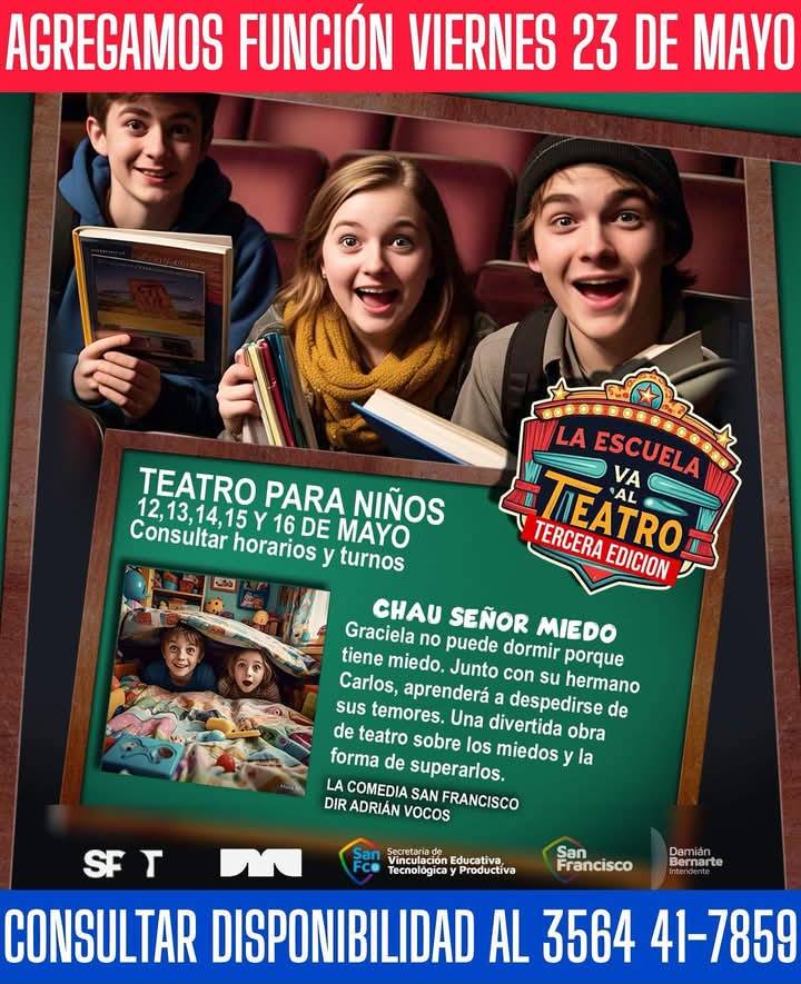 "Chau Señor Miedo", producción de La Comedia San Francisco, combina humor, emoción y contiene un mensaje inspirador sobre cómo enfrentar nuestros temores. En el marco del ciclo La Escuela va al Teatro – Tercera Edición, Spot Experiencias Artísticas en colaboración con la Municipalidad de San Francisco y la Secretaría de Vinculación Educativa, Tecnológica y Productiva proponen este ciclo para acercar a los más chicos al mundo del teatro de manera lúdica y educativa. Bajo la dirección de Adrián Vocos y tras el éxito rotundo de 14 funciones con entradas agotadas, se suma esta nueva fecha para que más escuelas puedan disfrutar del espectáculo. Más de 2.500 niños y niñas fueron parte de este programa.