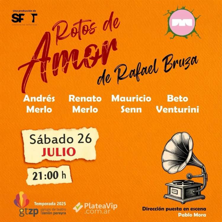"Rotos de Amor" es una comedia emotiva que sigue la historia de cuatro amigos visitadores médicos, unidos por su soltería y distintas formas de enfrentar el desamor. Rodríguez sufre una infidelidad, Berlanguita vive un amor platónico inalcanzable, Artemio intenta recuperar a su expareja y El Mudo, recientemente viudo, atraviesa el duelo con la ayuda de sus amigos. Cada personaje explora su dolor con una dosis justa de humor y emoción, permitiendo al público identificarse con sus vivencias. A través de situaciones cómicas y entrañables, la obra plantea interrogantes sobre el machismo, la soledad masculina y las dificultades afectivas de los hombres. Basada en un texto de Rafael Bruza, la puesta en escena combina la melancolía del tango con la picardía del humor popular, destacando el trabajo actoral del elenco, que transita con solvencia tanto los momentos dramáticos como los cómicos.
