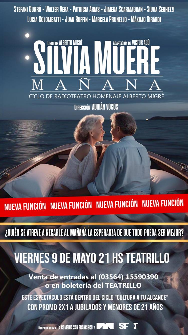 ¡Regresa el aclamado ciclo de Radioteatro al Teatrillo, homenaje a Alberto Migré, con un nuevo capítulo que te atrapará!. En “Silvia Muere Mañana”, nos adentramos en la mágica y serena ciudad de Luján. A pesar de los vaivenes del mundo moderno, Silvia enfrenta su destino con valentía. La incertidumbre de su mañana nos invita a cuestionar: ¿Quién se atreve a privarle a la vida la promesa de un nuevo amanecer? A través de sus ojos, exploramos la lucha entre el desasosiego y la esperanza, recordando que, incluso en los momentos más oscuros, siempre hay un atisbo de luz. Producido por la Comedia San Francisco, dirigido por Adrian Vocos. Elenco: Stefani Curro, Walter Vera, Patricia Arias, Jimena Scargmanan, Silvia Seghezzi, Lucia Colombatti, Juan Ruffin, Marcela Prunello y Máximo Ghirardi.