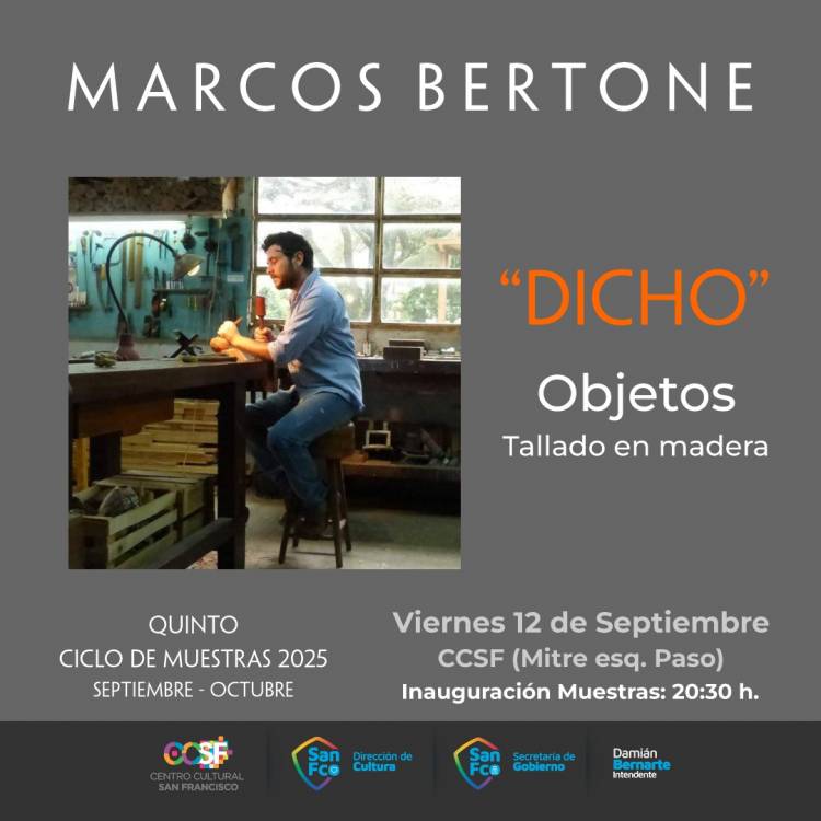 En “Dicho”, Marcos Bertone, artista oriundo de nuestra ciudad, autodidacta con marcada influencia por el oficio de su padre, quien fue modelista motriz, y por su madre, maestra de educación artística, propone una muestra con una serie de objetos tallados en madera, en la que emerge la comunicación humana como centro de su trabajo.