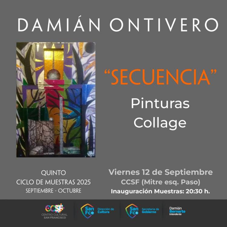 “Secuencia” es la muestra de Damián Ontivero, reconocido artista plástico y maestro de artes visuales de la ciudad de San Francisco, y activo organizador de muestras artísticas culturales colectivas, integrales e inclusivas. Se exhiben pinturas, dibujos y obras con técnicas de collage. En sus trabajos construye atmósferas en la que se entrecruzan y logran presencia, el plano espiritual, el físico y lo sobrenatural, en los espacios del barrio y su cotidianidad.