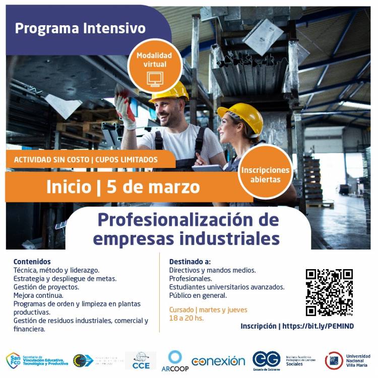 La tercera de las propuestas contempladas en este convenio tiene que ver con dictado de un programa intensivo de *Profesionalización para Empresas Industriales*, que será sin costo, con modalidad virtual, orientada a directivos y mandos medios, profesionales, estudiantes avanzados y público en general. El mismo dará comienzo el 5 de marzo, donde se abordarán temas referidos a técnica, Método y liderazgo, Estrategias y despliegue de metas, Gestión de proyectos, Mejora continua, Programa de orden y limpiezas en plantas productivas, gestión de residuos industriales, comercial y financiera.
