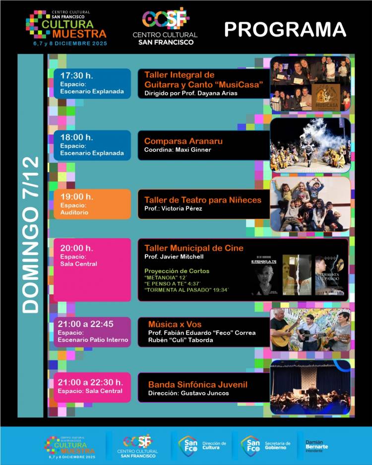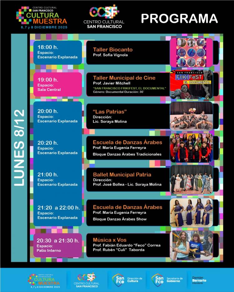 La Municipalidad de San Francisco, a través de la Dirección de Cultura, dependiente de la Secretaría de Gobierno llevará a cabo “Cultura Muestra”, los días 6, 7, y 8 de diciembre en el Centro Cultural San Francisco, ubicada en calle Mitre esq. J.J.Paso, de 17:00 a 22:30 hs. La entrada es libre y gratuita.