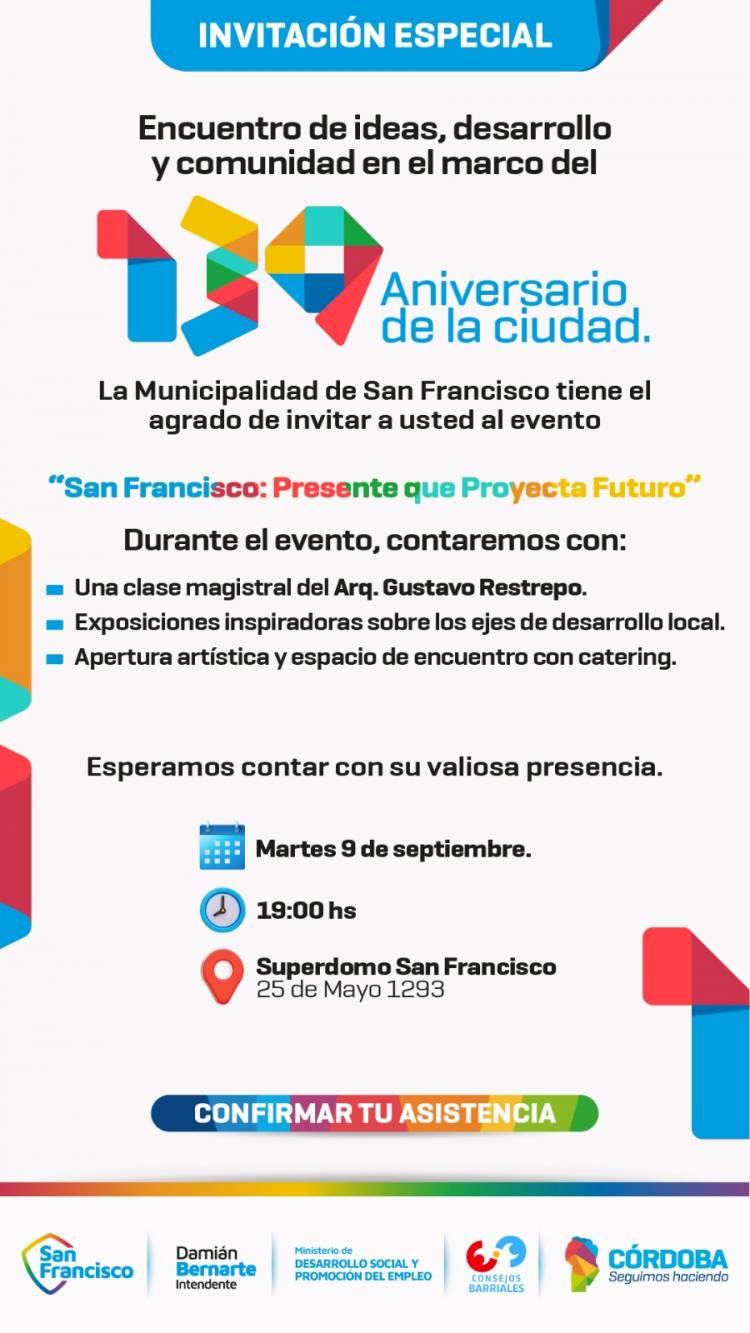 Este martes 9 de septiembre a las 19hs., en el Superdomo, se llevará adelante un encuentro de ideas, desarrollo y comunidad, en el marco del 139º Aniversario de la ciudad de San Francisco.