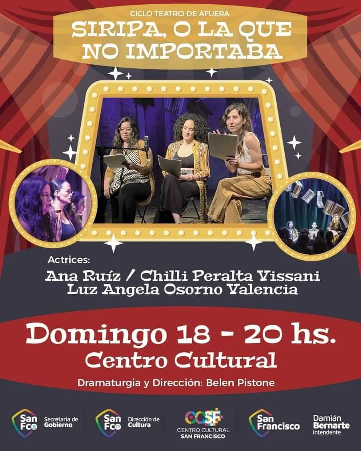Además, este domingo18 de agosto a las 20 horas, en el marco del ciclo `Teatro de Fuera´, se presentará en nuestra ciudad la obra de teatro “Siripa, o la que no importaba”, dirigida por la sanfrancisqueña Belén Pistone. La entrada para presenciar el espectáculo es libre y gratuita.