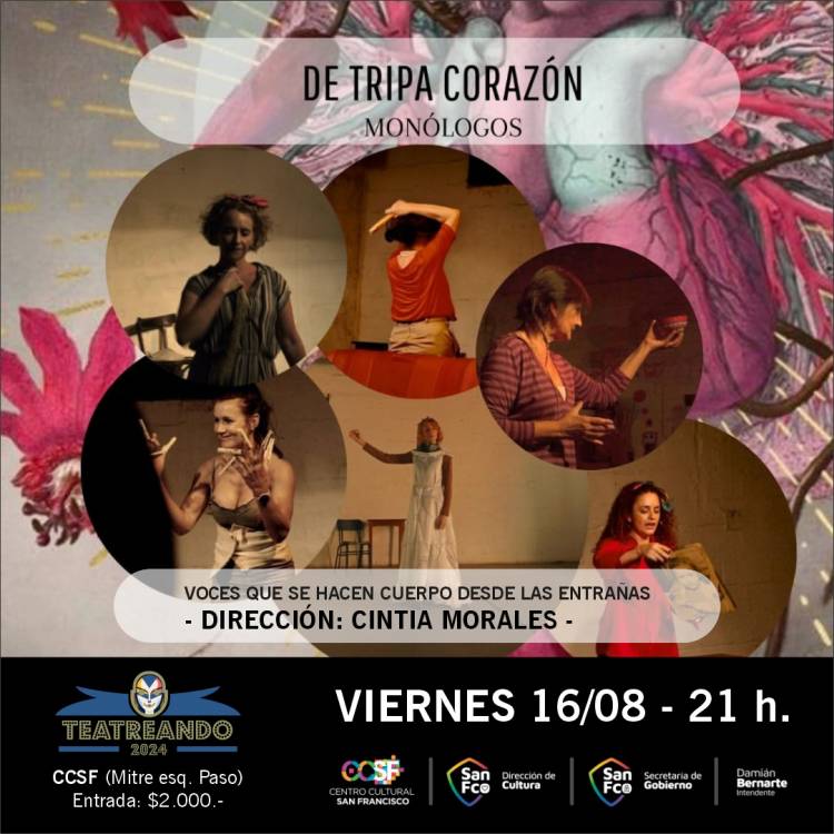 El ciclo quedará inaugurado el viernes 16 de agosto a las 21 hs. con la presentación de la obra “De tripa corazón” / Monólogos. Textos cercanos e íntimos. Seis monólogos, seis mujeres atravesadas por los textos de Sandra Massera, Vero Ruat, Santiago Alassia, Graciela Geller. Voces que se hacen cuerpo desde las entrañas. Con la dirección de Cintia Morales y la actuación de Marina Toledo, Mariana Panero, Vero Ruat, Iris Rostagno, Eve Ferratto y María Depetris.
