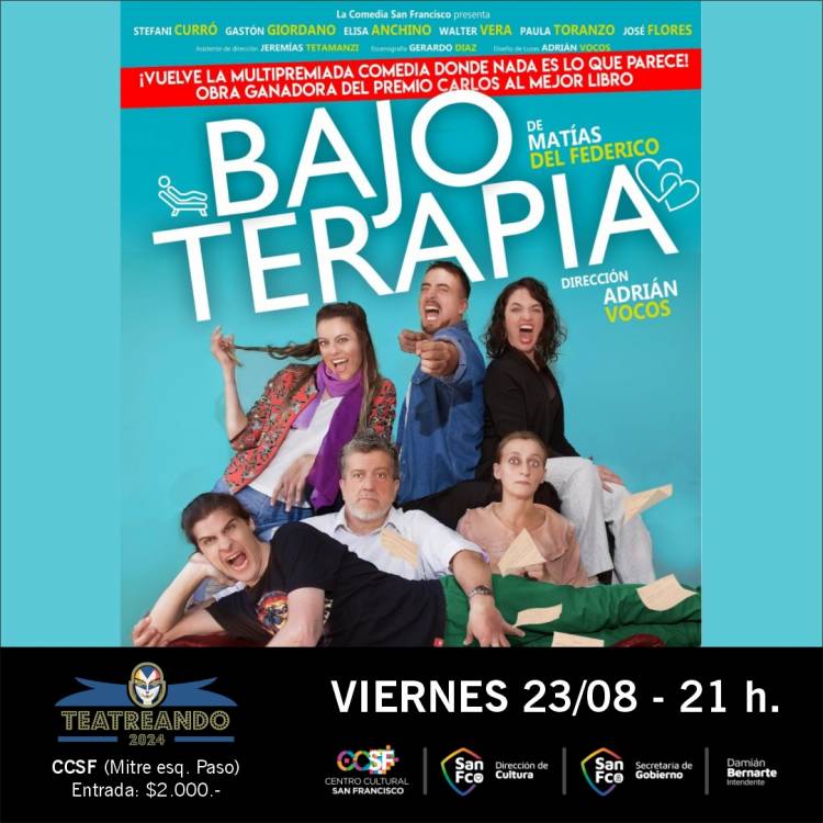 El viernes 23 de agosto se presentará “Bajo Terapia”, de Matías Del Federico, propuesta de la Comedia San Francisco, con dirección de Adrián Vocos y la actuación de Stefani Curró, Gastón Giordano, Elisa Anchino, Walter Vera, Paula Toranzo y José Flores; asistencia de dirección de Jeremías Tetamanzi, escenografía de Gerardp Díaz y diseño de luces de Adrián Vocos. Bajo terapia es una comedia ágil e inteligente que no da respiro. Tres parejas acuden a una terapia de parejas para resolver sus conflictos, sin embargo, nunca aparecerá la psicóloga que ha dejado sobres para tratar sus temas a resolver entre ellos generando un caos interminable de risas y donde nada es lo que parece. Ganadora del Premio Carlos al mejor libro, ganadora del premio Estrella Concert y declarada de interés cultural por la Legislatura de la Provincia Córdoba.