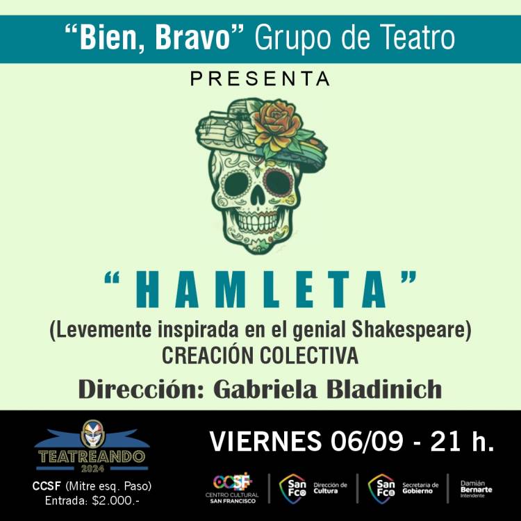 El viernes 1º de septiembre el Ciclo Teatreando 2024 cierra con la presentación de “Hamleta”, obra de creación colectiva (levemente inspirada en el genial Shaquespeare), que presenta Bien, Bravo Grupo de Teatro, con dirección de Gabriela Bladinich.