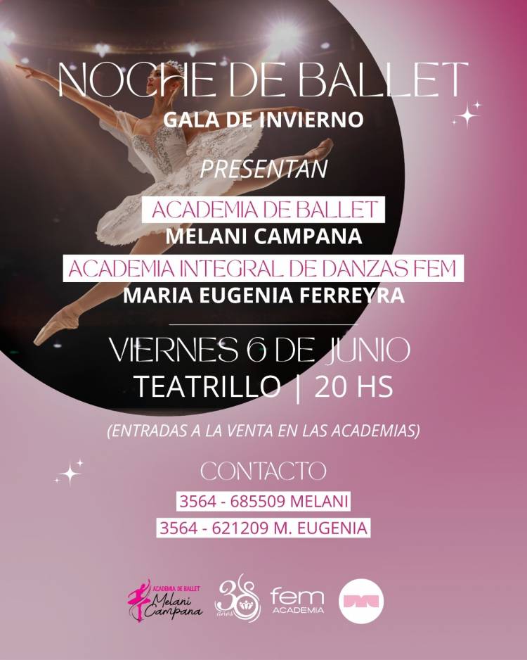 La Academia de Ballet de Melani Campana y la Academia Integral de Danzas FEM de María Eugenia Ferreyra presentan la Gala de Invierno. Una noche mágica donde el arte y la danza se unen en un escenario lleno de talento y emoción. La gala reunirá a más de 100 bailarines en escena, presentando una variedad de estilos que incluyen danza clásica, jazz, contemporáneo y danzas árabes. Este evento marca el cierre de la primera etapa del año para ambas instituciones y promete ser una noche inolvidable para los amantes de la danza.